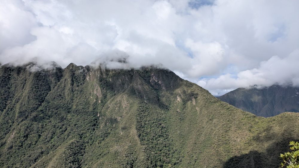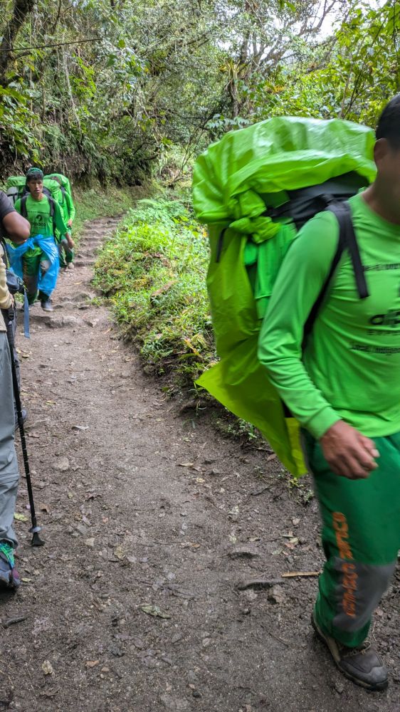 路上遇到不少挑夫,背着大背包,有的下坡还跑起来了。导游说,印加古道上有马拉松比赛(全长40多公里,正好一个马拉松的距离),冠军用时6个多小时。有个挑夫自己试了一下,结果三个多小时就跑完了。我有点不太相信:挑夫跑越野能比K天王还快?可能是中国功夫里的扫地僧那样的传说而已,不必当真。这个绿色的好象是一个叫绿色机器(Green Machine)的公司的人。一路上见到很多绿色机器。
