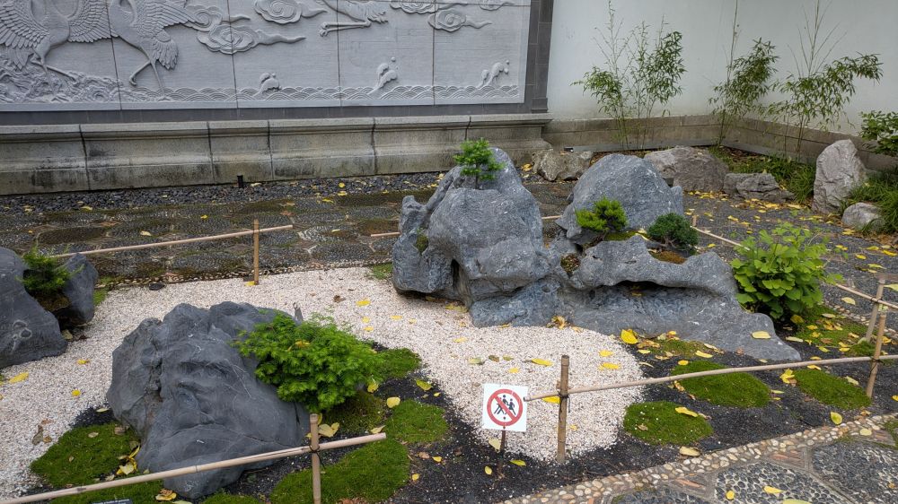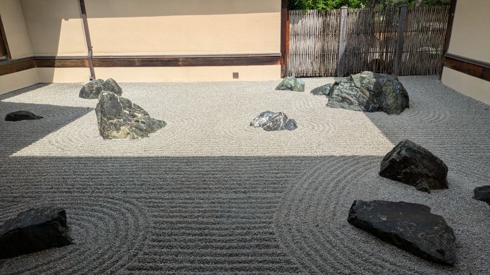 枯山水花园(karesansui gardens) 是日本宗教的一部份。一片沙石,中间有些岩石,是坐禅静思的地方。