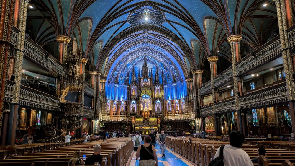 蒙特利尔圣母圣殿(Notre-Dame de Montréal Basilica) 这个教堂很有特色,其它教堂大部分是金碧辉煌,这里是鲜艳的蓝光。