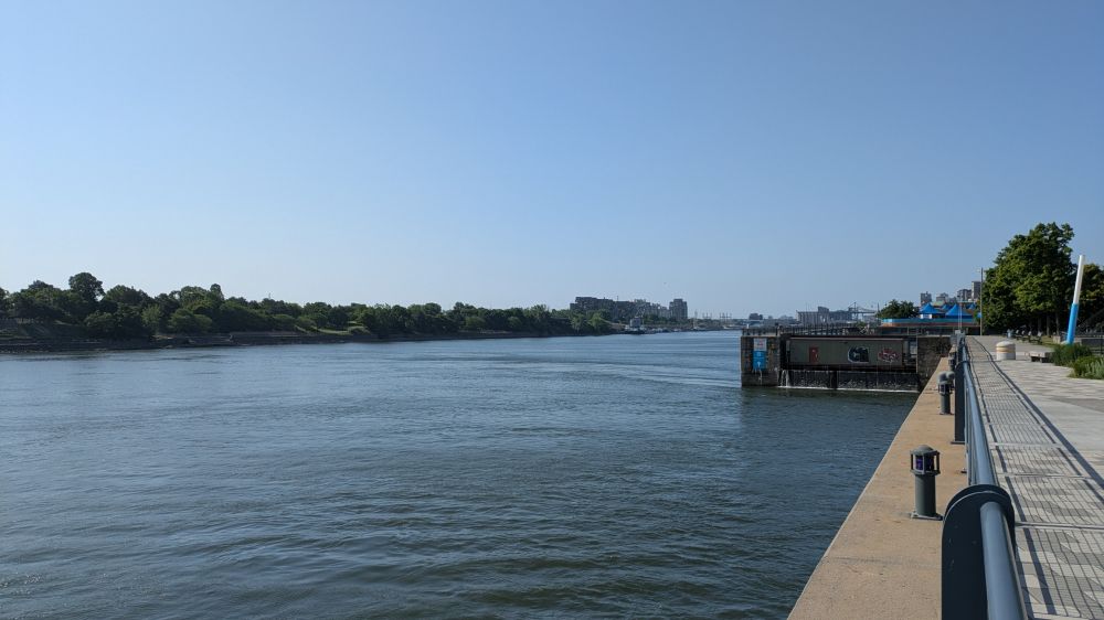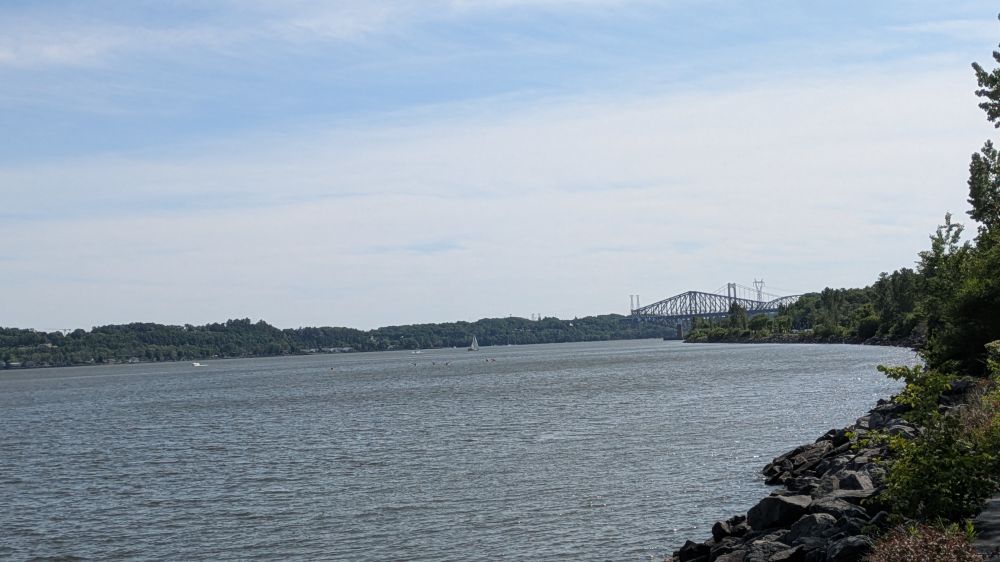远处隐约能看到魁北克桥,形状很特别,部分三角形部分圆弧形。