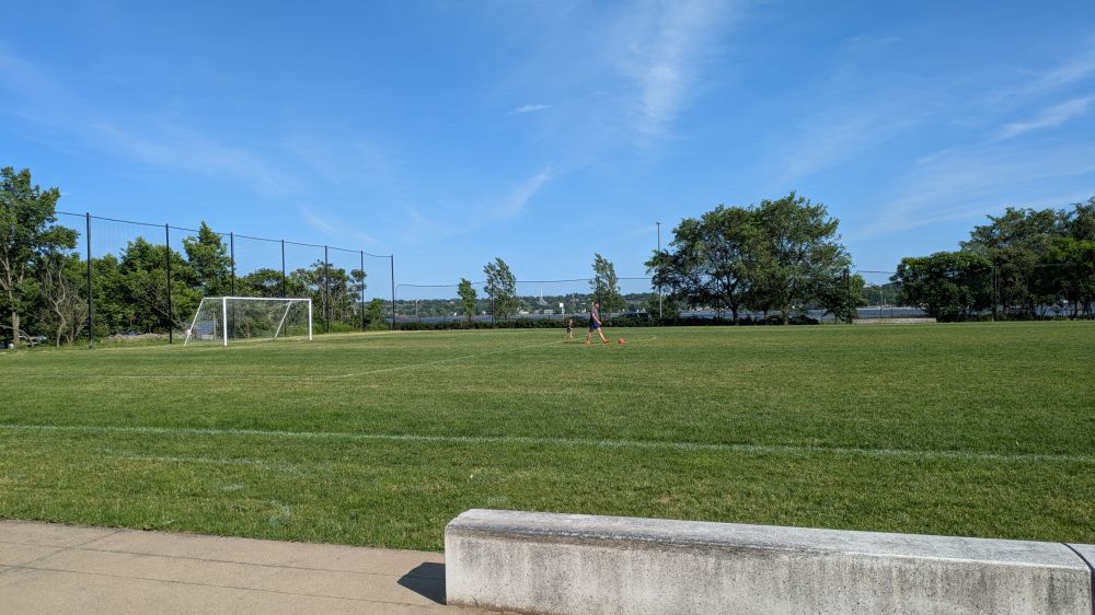 看到河边的一个足球场,很漂亮的绿草地上,一个父亲带着一个小孩在玩足球,妈妈在另一边躺椅上休息晒太阳。这个画面非常祥和。加拿大真的是地广人稀。我记得以前在国内的时候,坑坑洼洼的土地球场满满都是人,有时候把一个大球足球场分成四个小球场,大家踢得不亦乐乎。这里这么好的球场,只有父子俩在玩耍。一个人出生在不同的时间和地点,就会有这样不同的待遇。有时候会觉得不公平,投胎真的很重要。