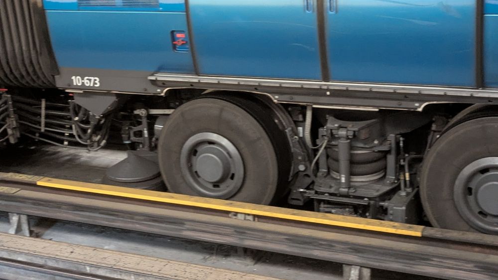地铁的车轮很有意思,不是一般的铁轨上面的铁轮子,看上去像汽车的轮胎。