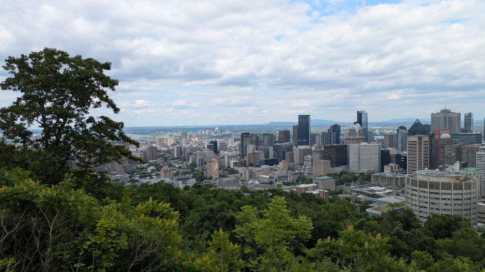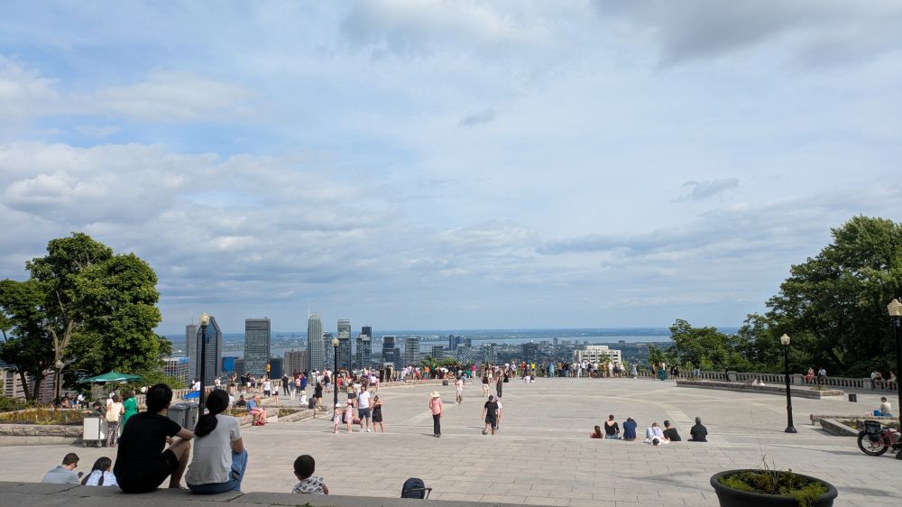 我们去蒙特利尔西边的皇家山(Mount Royal)转了转,需要地铁换公交才能上去。蒙特利尔市是因这座山命名的。蒙特利尔原来叫Ville-Marie,后来改成蒙特利尔。法语中real和royal意思相同, Mount Royal就演变成了Montreal。从山上可以看到蒙特利尔的全景。山顶上游人如织。