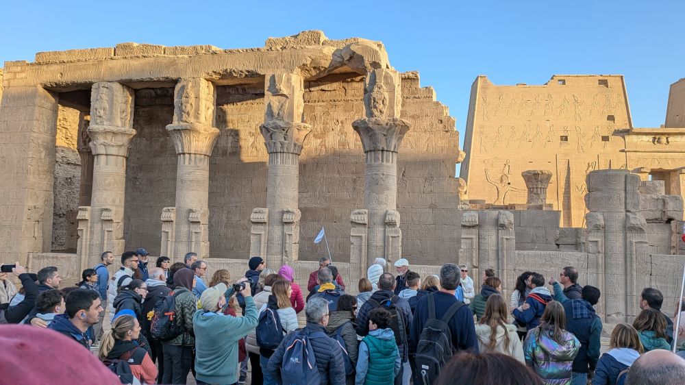 12/31. 今天又要看两个神庙,一个是埃德夫(Edfu)神庙,也叫荷鲁斯神庙(Temple of Horus) ,另 一个是科姆翁布(Kom Ombo)神庙。第二个神庙边上还有一个鳄鱼博物馆。