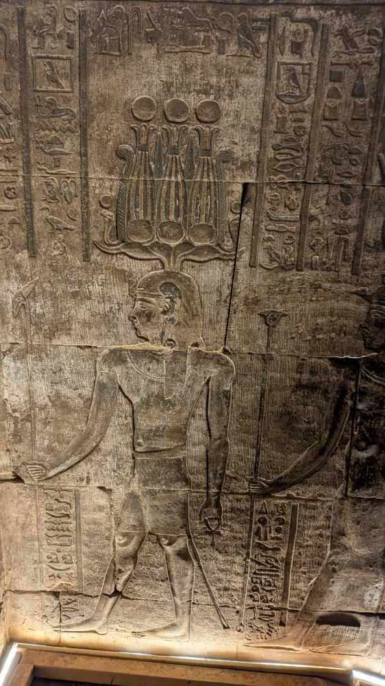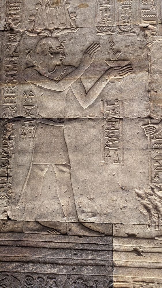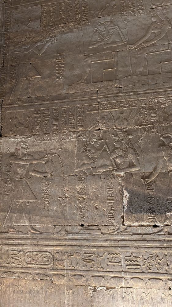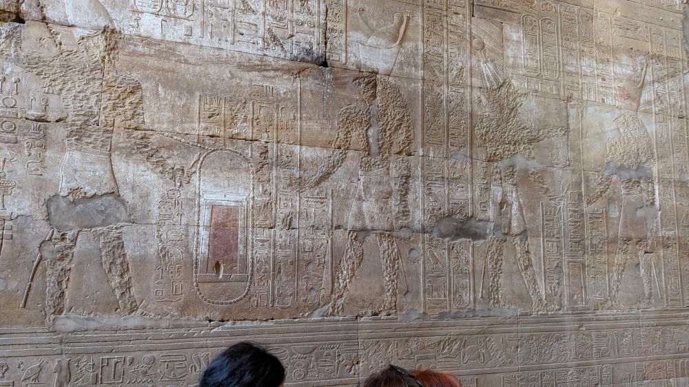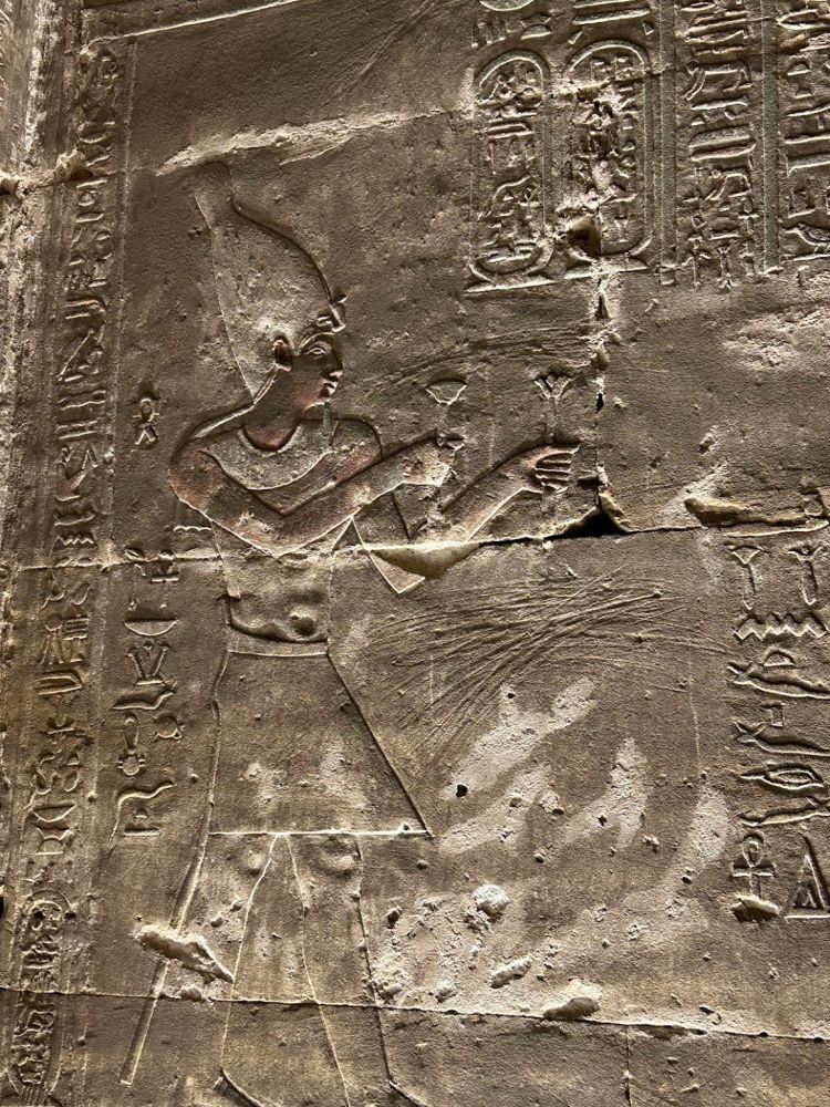 这个神庙的浮雕和前面看过几个神庙有很多类似的地方,但是也有不同之处。比如这里的浮雕颜色大部分就是石头的原色。下面这个浮雕献祭者上身算是有点颜色,这是这个神庙里极少数带颜色的浮雕。