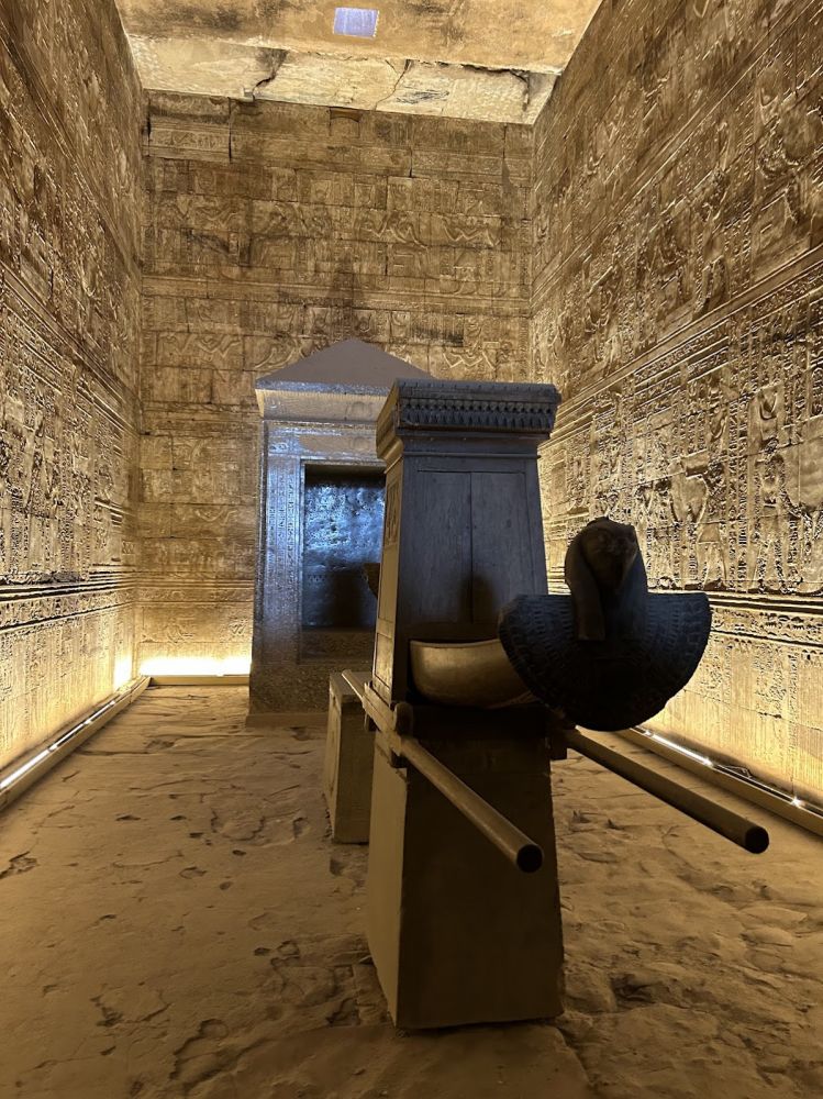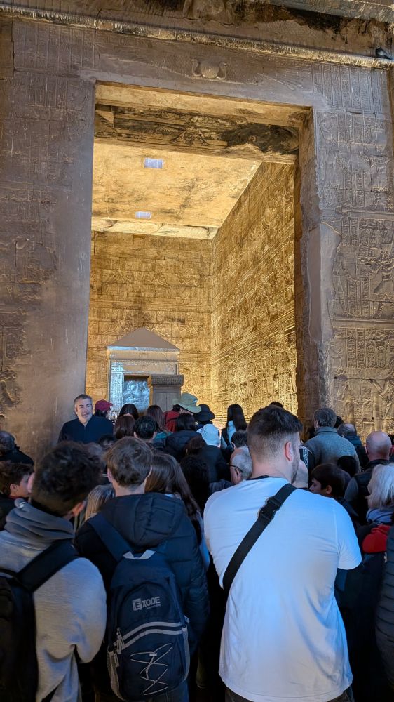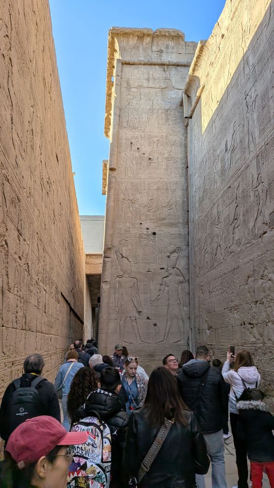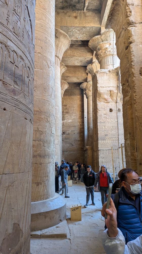 很多壁画脸上身上都损坏了,看上去很明显是人为的。我们问导游为什么有这些好像用凿子故意凿掉的,他说是阿拉伯人征服埃及以后,因为宗教的原因把这些埃及的神像毁掉。我后来回去查了一下chat gpt,说是早期的基督徒干的。对埃及神像的损毁有几种原因,一种是基督徒,他们认为这些偶像必须毁掉,不然就是敬拜偶像。但这其实只是对单个的壁画进行损毁,而穆斯林也做同样的事情,但是他们是大规模的毁坏,比如把整个神庙毁掉。还有一个原因就是自然界的风吹雨打。不知道为什么导游要把屎盆子扣到阿拉伯人头上。我想可能是因为他看到旅游团里大部分是美国来的,是基督徒的可能性比较大,不愿意让顾客难堪吧。对我来说,我宁可难堪也要听实话。