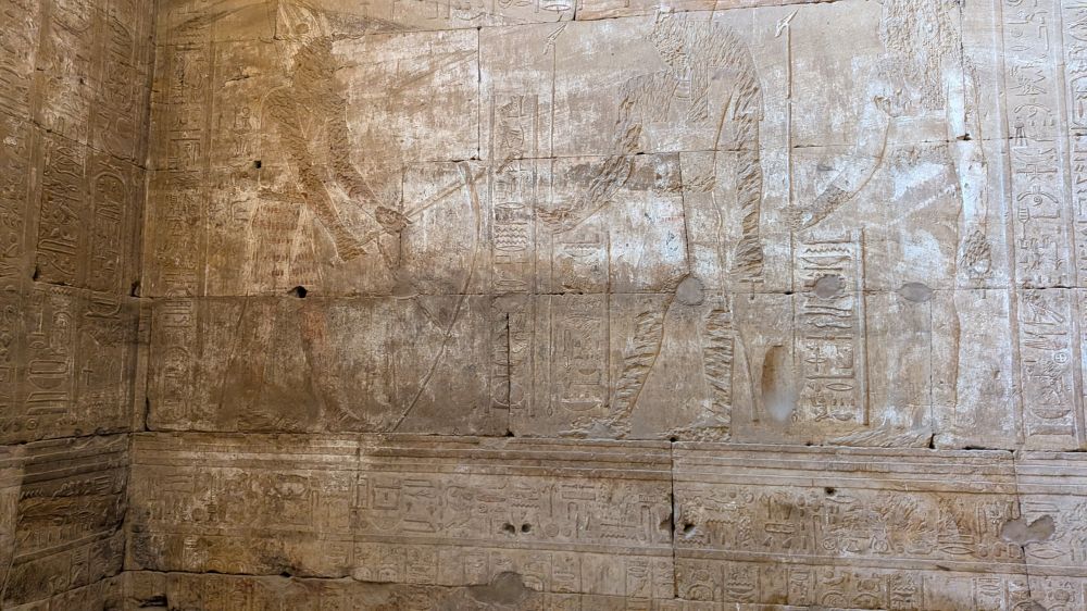 下面这幅浮雕描绘了荷鲁斯神和塞特神之间的神话冲突。荷鲁斯通常被描绘成鹰头人身。他为父报仇,杀死了象征干旱和混乱的塞特(Set)。 塞特通常以一个小河马的形象出现 (如同下面这个浮雕右下方) 。 图中代表荷鲁斯的形象是一位鹰头神,他站在船上,手持鱼叉扎向小河马。船上另一位是荷鲁斯的妈妈(Isis) 。