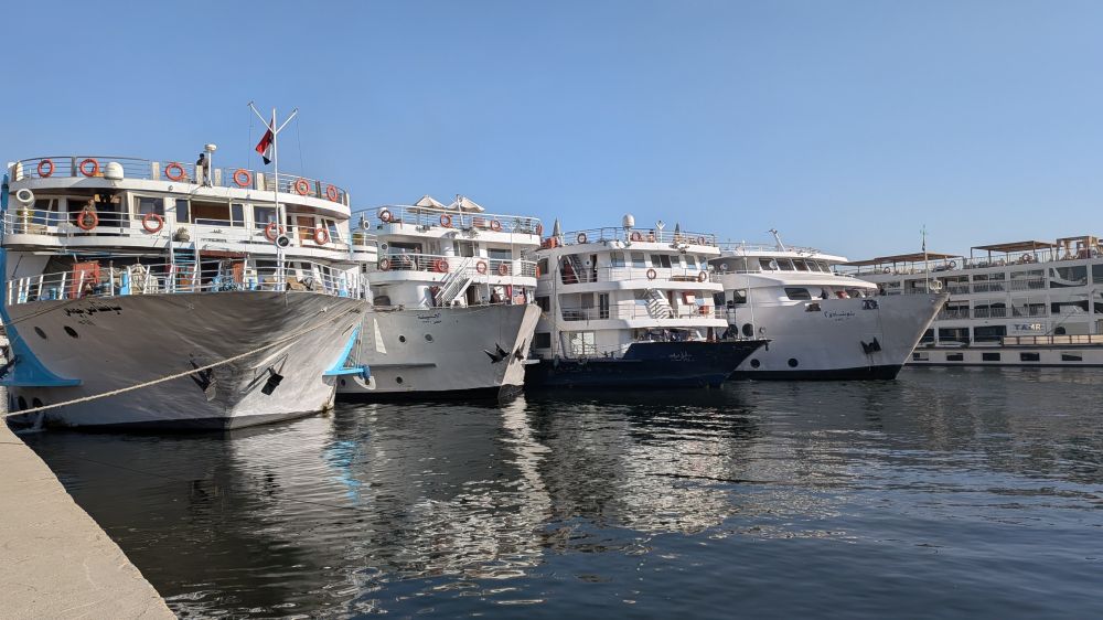 在神庙里转了大概两个小时后,坐车回到了游轮吃午饭。到了尼罗河边,发现我们的船不在岸边,停在另外一个地方。导游跟船上的人联系,人家说会把游轮靠到岸边来。这游轮一个接一个的紧挨着,就好像停车场一样,要从停车位里倒出来还挺费时间。我们等了好一会儿才上船。