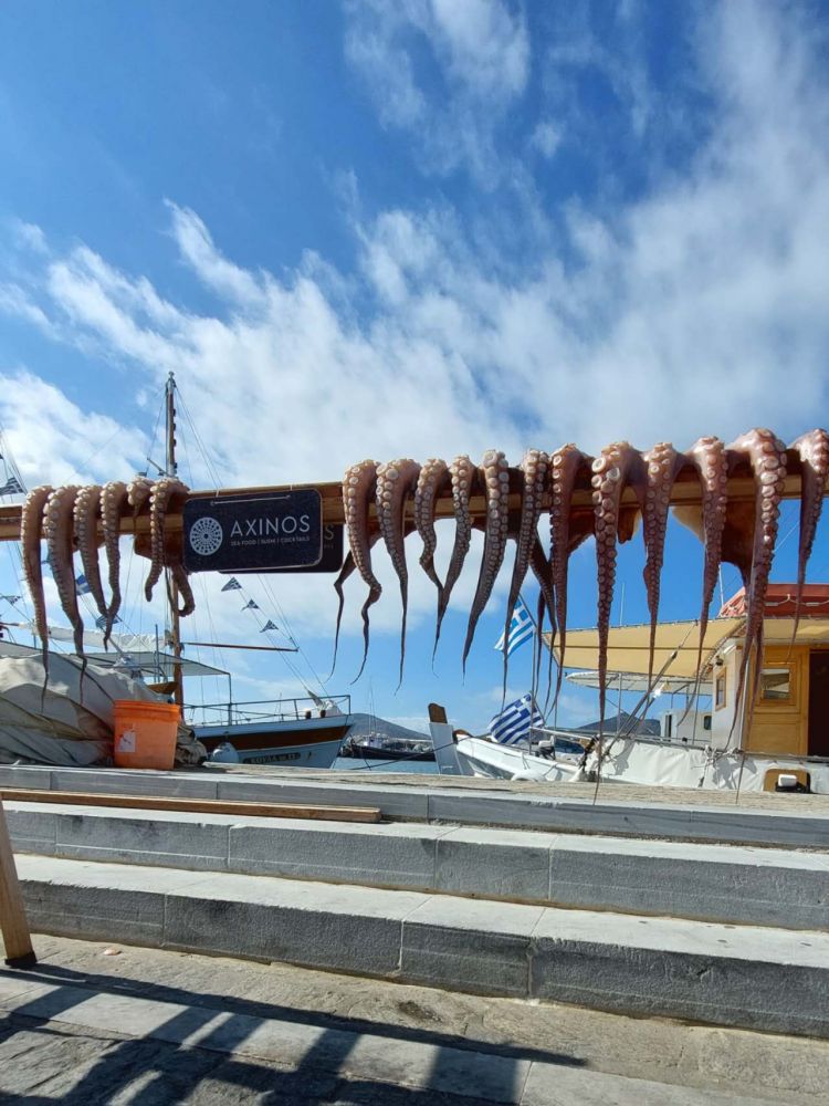 下了巴士,乘客各自走散,消失在我身后的空气里。踏上长长的渔码头,两个坐在长椅上的本地妇女远远投过来注视的目光。一个年轻渔民正在码头边用小刀打理刚捕到的鱼货,细皮嫩肉的样子,想起晒成“青铜像”的海明威,希腊人是不是天生晒不黑的“浪里白条”?