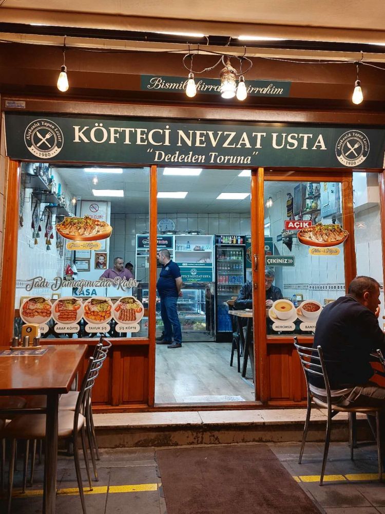 这家餐馆紧挨着清真寺,价廉味美。名字是:KOFTECI NEVZAT USTA (内夫扎特肉丸大师) 是我进入土耳其以来最合胃口的一顿晚餐:烤面包又松又脆,打10分。酒店,旅馆,餐厅通常只供应未烤的冷面包,除了偶尔的法式炸吐司。烤鸡肉 9.5分(因为是烤的,自然有点烟味)配菜,佐料9.8分,仅仅收了125里拉,换在别处,且不说味道如何,价钱一定翻倍。