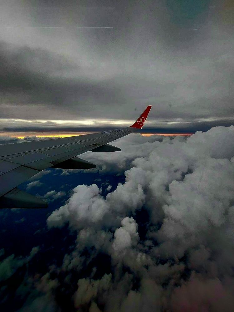 时间成为Meaningless. 再次登机,每人一瓶可乐或矿泉水。接着下雨了,暴雨。水流在铉窗上滑落,一帘幽梦,天色渐晚。终于感觉到了飞机在滑行,抖动,一瞬间失重:上天了。云水苍苍,暮色茫茫,铉窗外“土航”红红的尾巴,看上去很美。