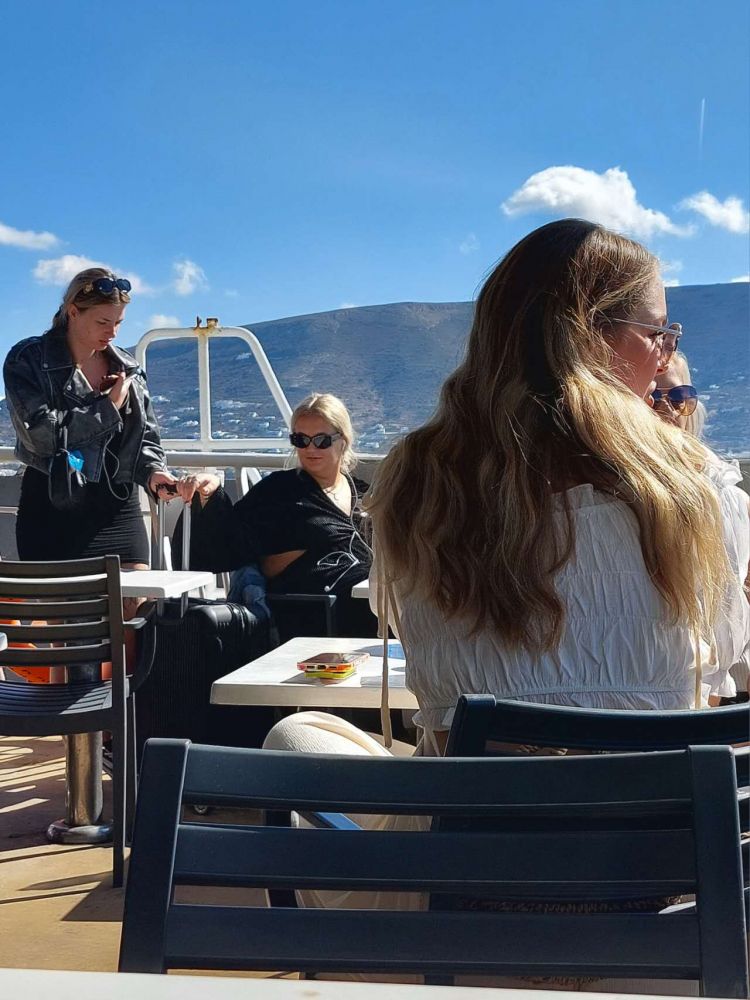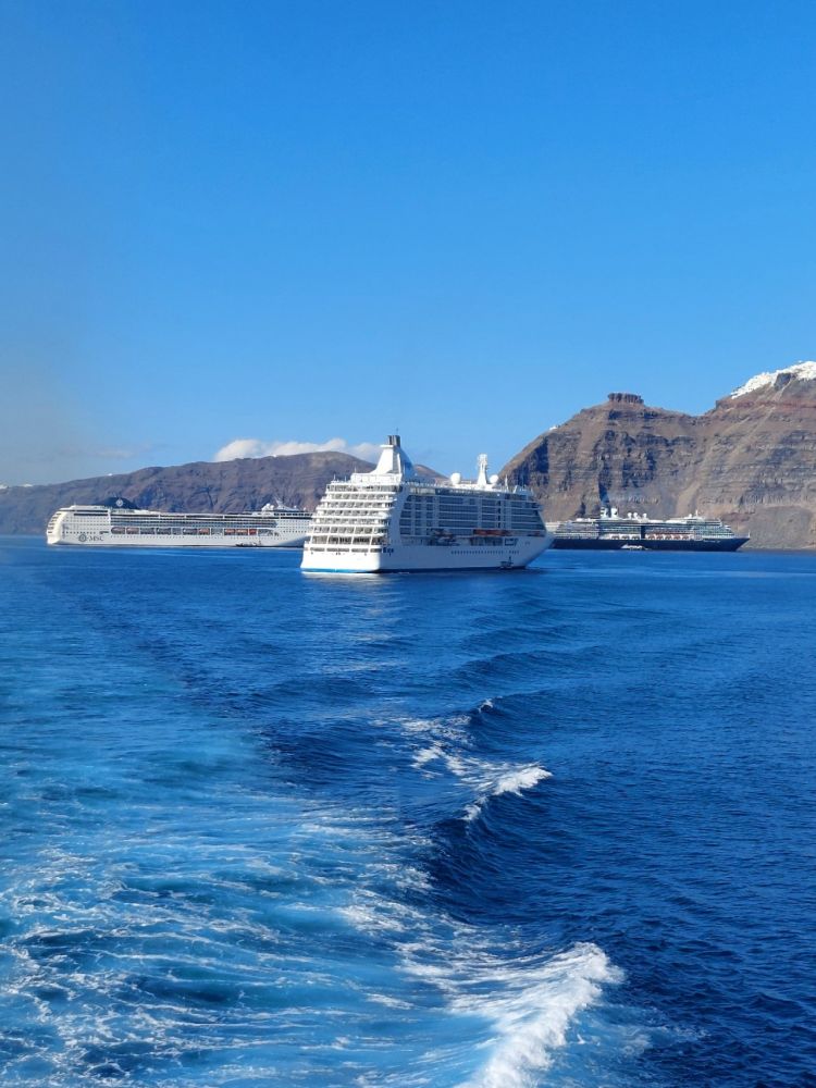 从帕罗斯乘渡轮去圣托里尼有“快船”和“慢船”:快船直达,不到两小时。慢船会在沿途停靠,上下乘客。如果性子不急,不赶时间,三五个小时慢船省钱且悠悠的看风景也是一种“绿皮火车”似的享受。