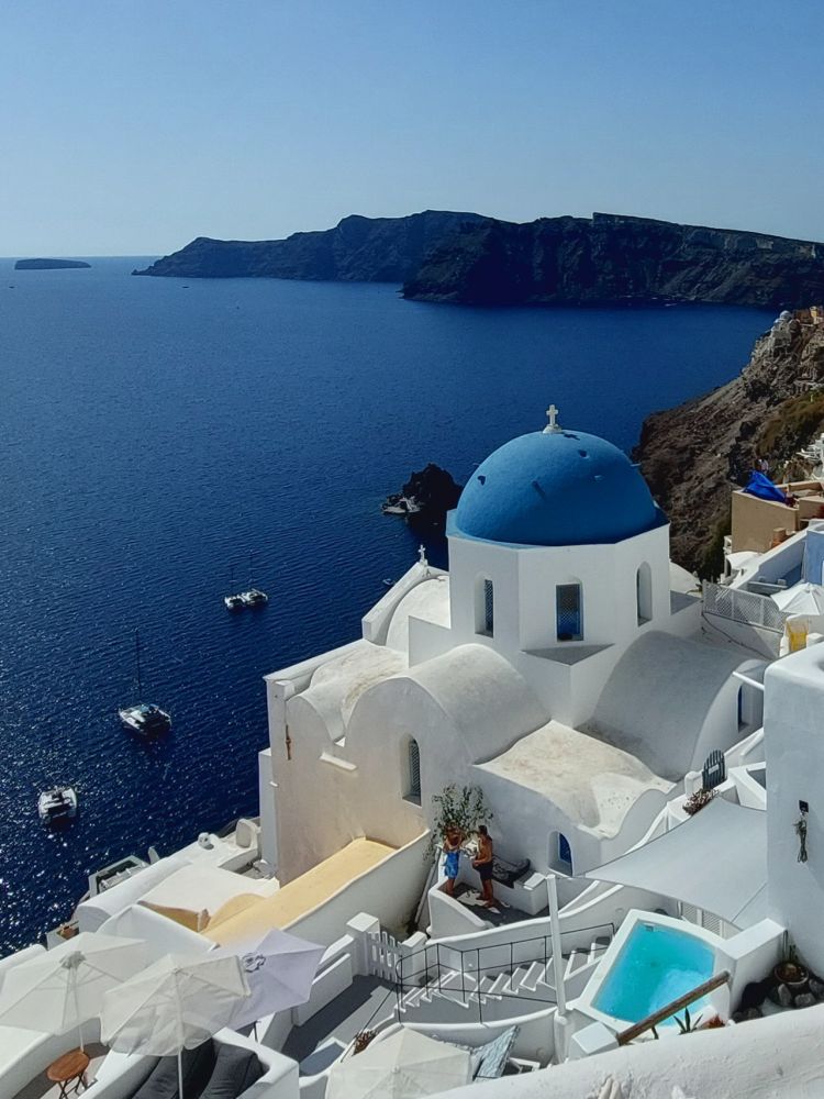 2)住店:提前定下的旅馆,离圣托里尼行政区所在地费拉市 Fira 有十五分钟路程,下了巴士几分钟就到。不在城市核心区和旅游热点吃住是我的铁律:只要住得干净安全,交通便利。吃得新鲜卫生,不闹肚子。远离闹市,留宿在当地人的生活圈,反倒让你以合理的消费,吃到原汁原味的当地美食,领略普通人的衣食住行,没必要“物差所值”去品尝“预制菜”,睡漂白床单。