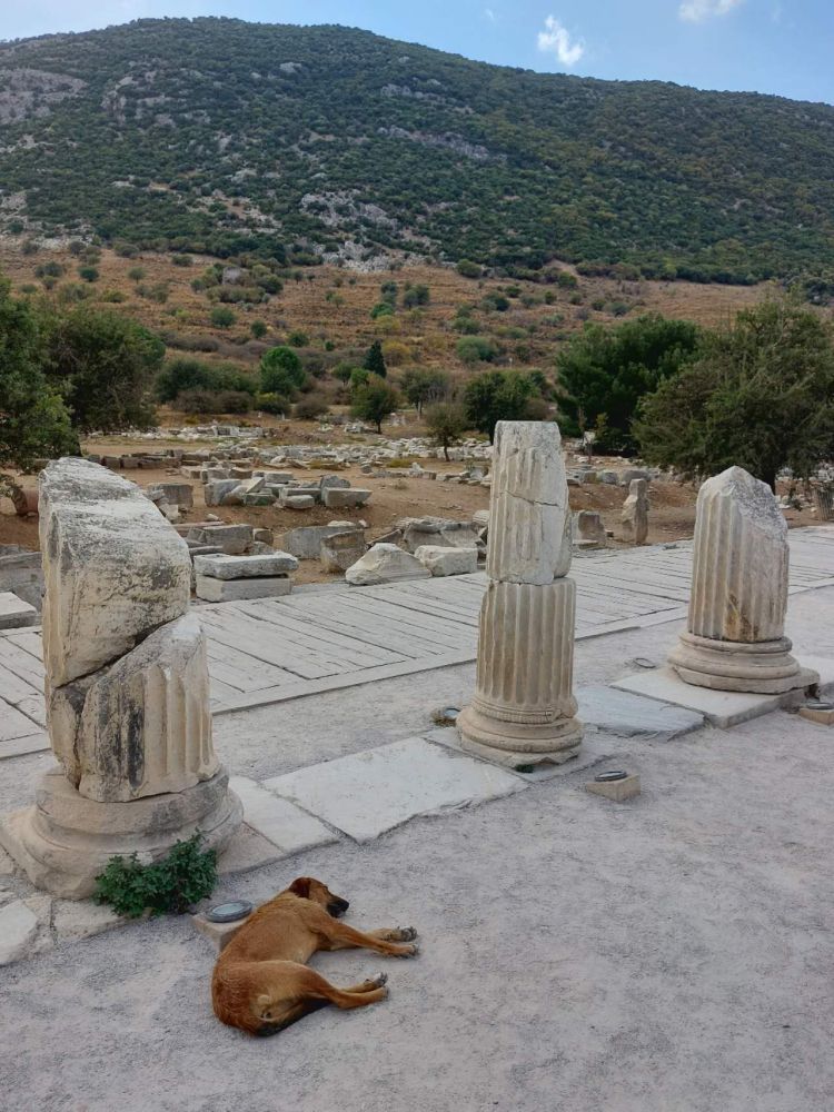 看见一条悄无声息躺在石柱边的流浪狗,联想起希腊罗德岛 B&B 掌柜麦哈勒斯的一席话:他老爹当年到非洲谋生,遭遇动乱被迫“净身”出户。移居到塞浦路斯,又被土耳其人“洗白”。听我说下一站会去伊兹密尔,他提议我到“以非所”看看那里的希腊古城,他一脸落寞忿忿然。终于明白告别时他看我尝柑桔,宛若看我尝酸葡萄:想想“以费所”:希腊人盖城,罗马人泡澡,土耳其收门票。