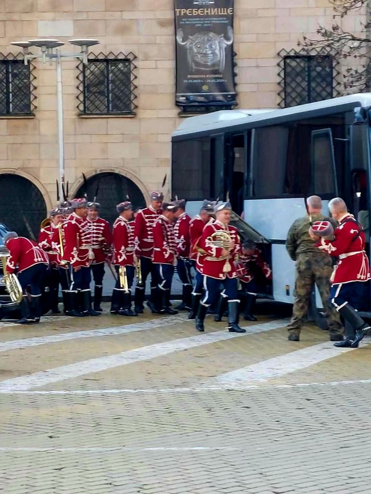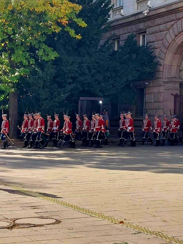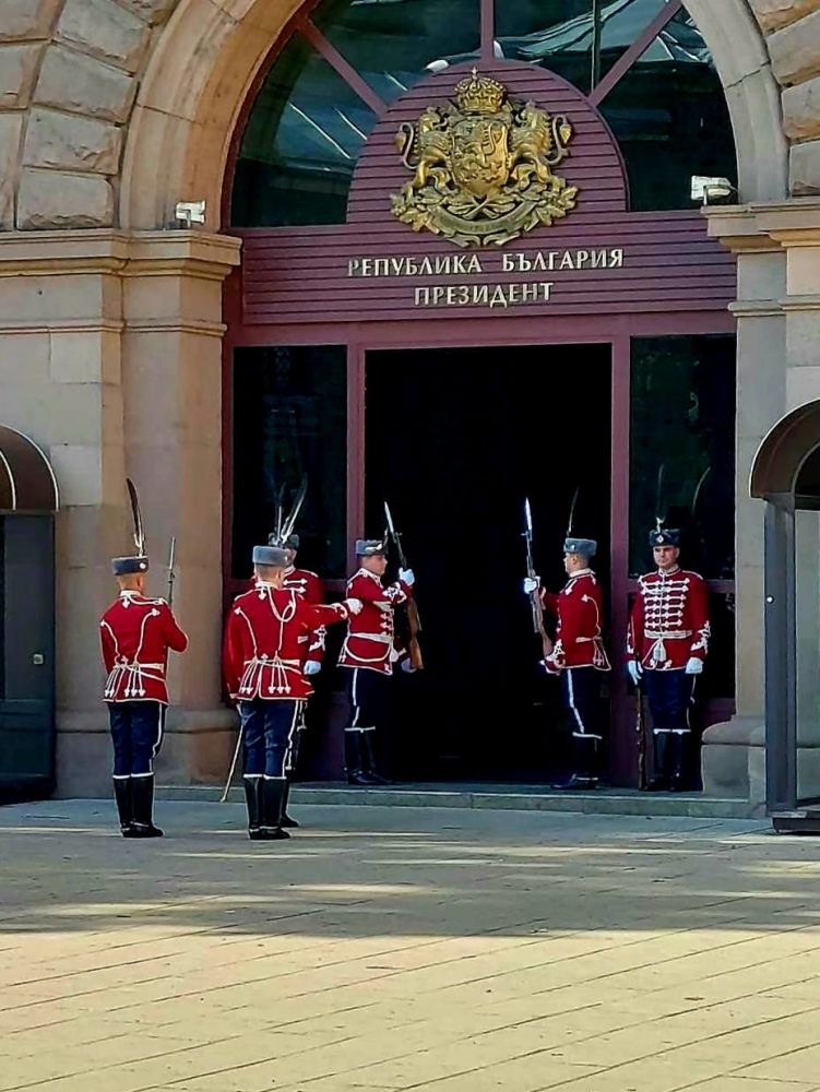 保加利亚总统府“大换岗”: 中午正点,着装因季节不同而改变。遇上不是天天都有的“大换岗”仪式,大概一个“排”的兵力:红衣,蓝裤,黑长靴,浅蓝绒帽上插一羽毛。“换岗”仪式结束后,仪仗兵整队离开,在街角上了淡兰色军用大巴,开车的司机是穿迷彩服的军人。换岗仪式在总统府前面大街上进行,有人在博文中写到,“经过简单的安检”,即没围墙,也没栅栏,反正我没看见到任何人被“安检”。