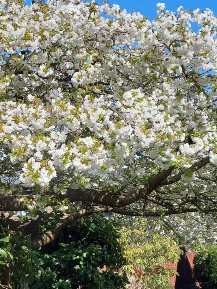 我家露台外,有两株樱花。一棵粉樱,在栅栏内;一棵“飘雪”,在栅栏外。去年冬天,春天,没有下雪,“飘雪”洁白的樱花开得像童话里的仙女一样美。轻轻柔柔的花朵,因为没有下雪,“飘雪” 不会在雪融时流泪。