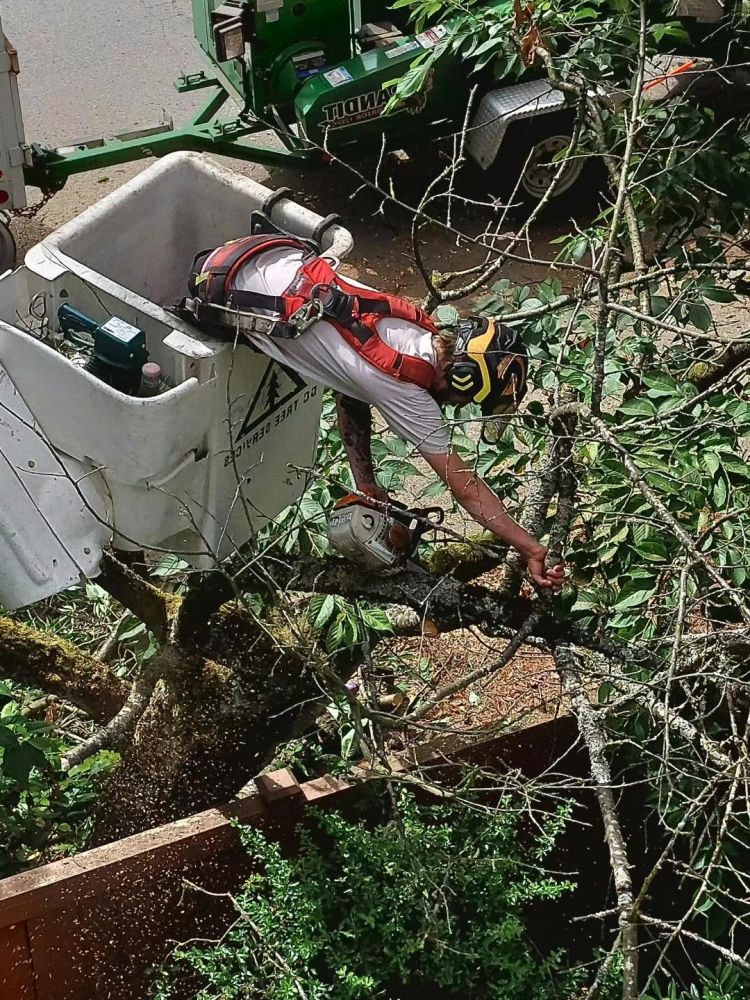 去年7月4日,早上听见窗外传来一阵轰鸣,探头一看:但见栅栏外一位“黄马甲”正驾着升降机,手持电锯,嗤嗤嗤对“飘雪”大动干戈。