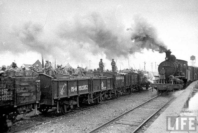 貨物上也坐満了阿兵哥。士兵們都累了,手握步槍[