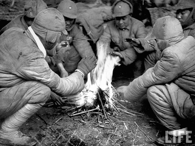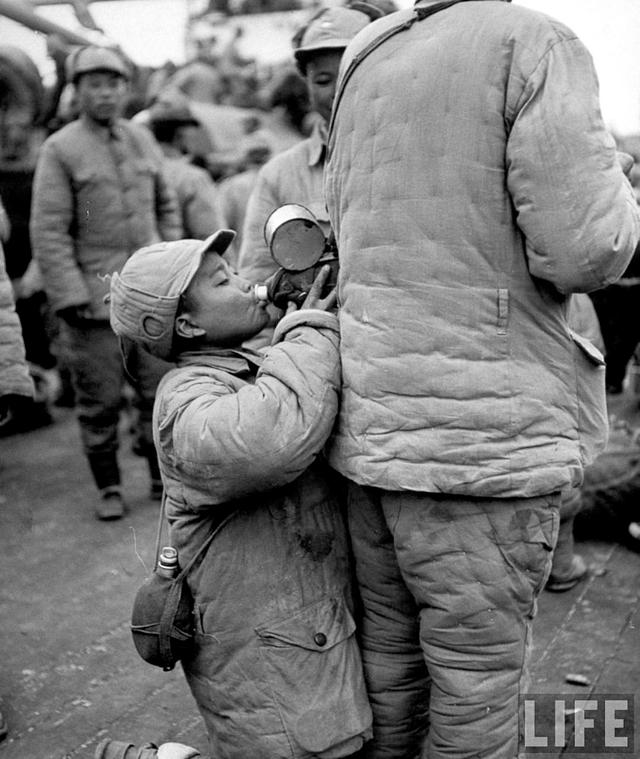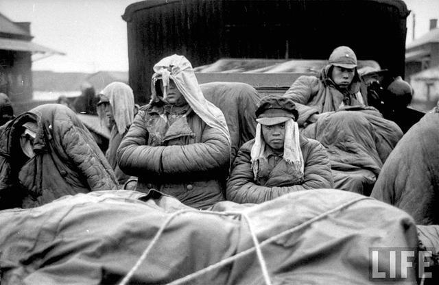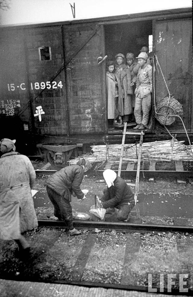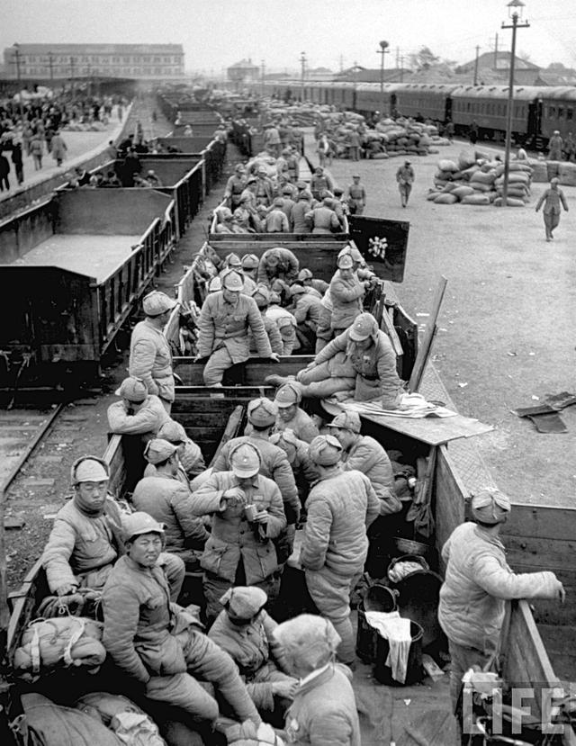 貨物上也坐満了阿兵哥。士兵們都累了, 手握步槍, 縮著身體, 或躺或坐, 靠在貨櫃箱 上, 貨車箱是沒有頂蓋的, 任憑外面的風吹雨打在臉上。