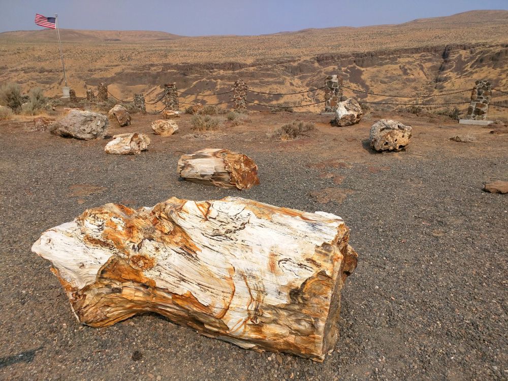 90号州际公路横贯华州,沿着90越过Snoqualmie山口没多久,景色立变,在平原上开一个小时就来到美西北第一大河哥伦比亚河河谷,而河岸边却是不毛之地。先别急着过河,河边下了高速就是银杏树石化木公园(Ginkgo Petrified Forest State Park)。一千五百多万年前,这里温暖湿润,草木林立。树木后来被火山灰掩埋,地下水从树干中流过,树干中的有机质被水中的矿物质取代石化,千万年后,这些石化木被大洪水冲刷显露。