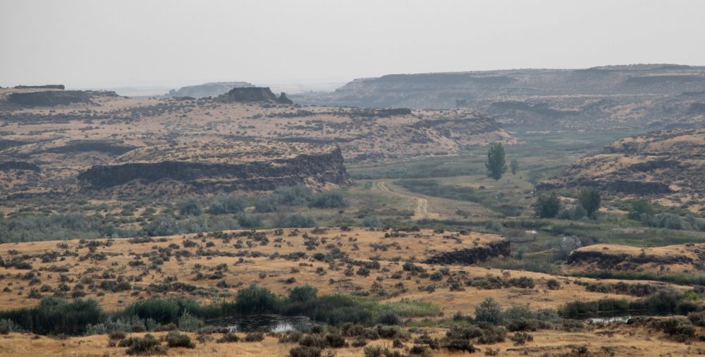 过了宽广的哥伦比亚河,下90,上26号公路,向东就是哥伦比亚野生动物保护区(Columbia National Wildlife Refuge)。一万多年前,7000多平方公里的米苏拉湖冰坝溃塌,洪水高达百米,以时速上百公里的速度扫荡华州东部。洪水的流量有多大?科学家估计,有世界上所有河流的流量总合的十倍之多。这样的洪水发生了不止一次,是多次,有科学家认为是上百次。这些洪水切割地表,沟壑纵横,形成了华州东部的河道疤地地貌(Channeled Scablands),其中以位于哥伦比亚野生动物保护区的Drumheller Channels最为典型,是美国国家自然地标。