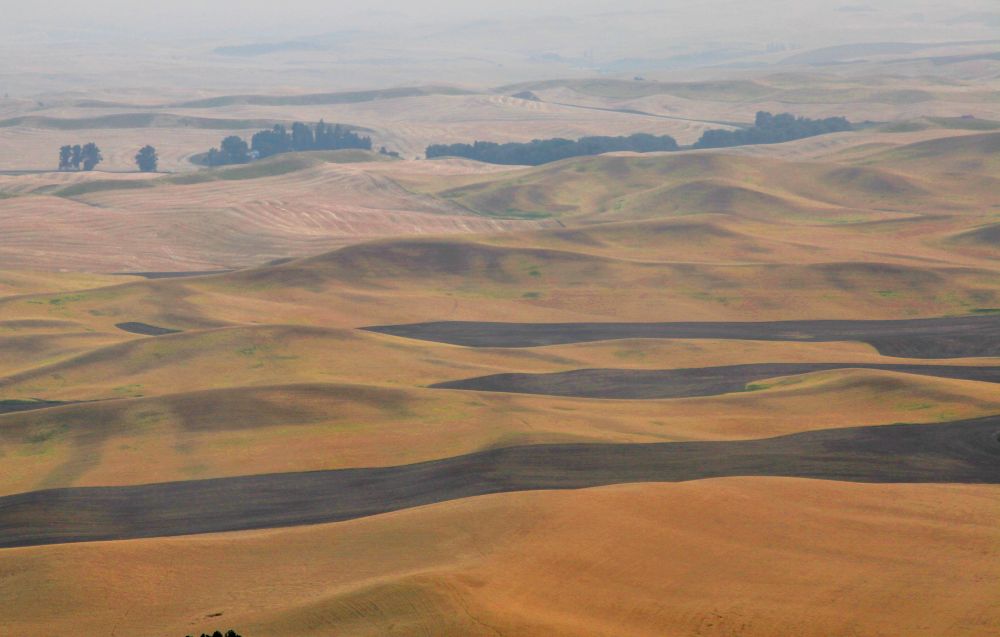 8月中旬,加拿大山火和蒙大拿山火,东部天空烟霾不散,连带一切景物失去了颜色,加上高温和不是周末,原来热闹的景点往往只有我们一家人。在Steptoe Butte山顶,夕阳的黄金时段,也只有一位来自新奥尔良的摄影师,呆了一会而便失望离开。这些景色见惯了平时的人头的攒动,如今一下清静,在我们面前难得的懒散随意。只是太阳急着下去,只留我们一家人,一坐山,一片田,很好。