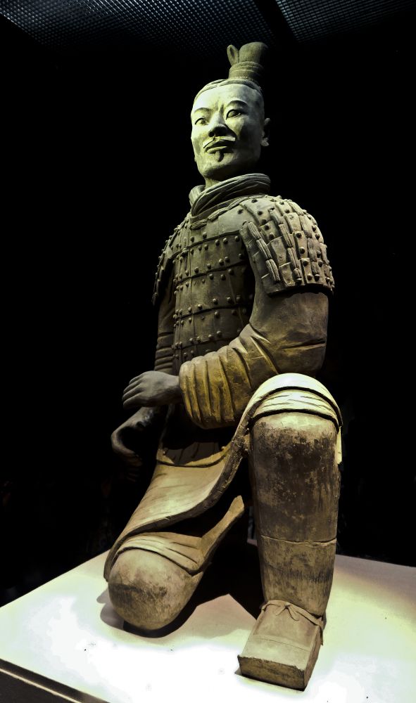 绿面跪射俑,披铠,左侧绾发髻,左腿曲蹲,比起一般的陶俑要更加精致。关于绿面的原因,专家众说纷纭,干脆就当外星人解释算了,这也找到了秦能统一天下的答案。