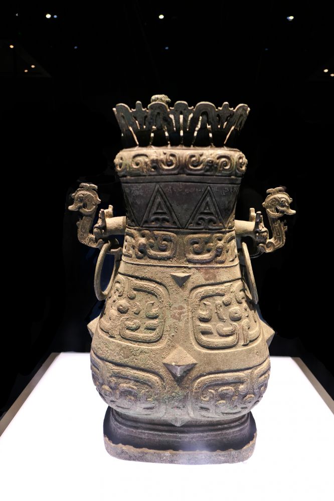 器口花边及颈部铸铭文四十五字,记述梁其作此尊壶,享孝祖先。颈两侧有一对兽头衔环耳,制作精巧。