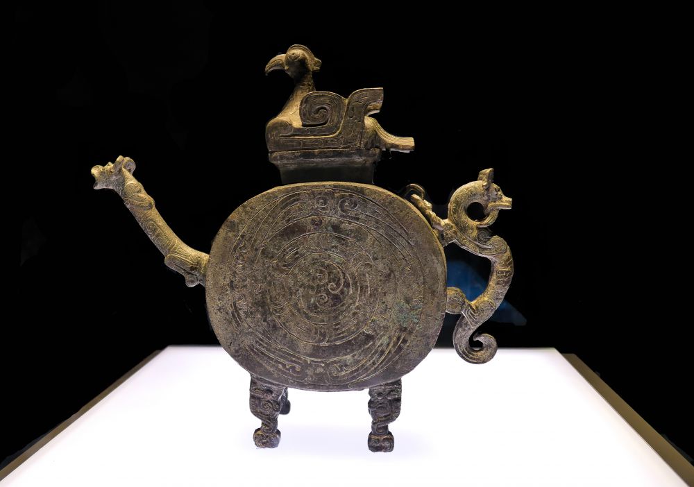 盉盖内铸有做器者的名字“它”,因而称为它盉。盉顶上铸有一双目炯炯、双翅微张的卧鸟,盉前有一长颈兽头为流,后有回首顾盼的龙为扳手。盉与盘经常配套使用,商周时宴前饭后要行沃盥之礼,盉用来注水,盘承接洗过的废水.