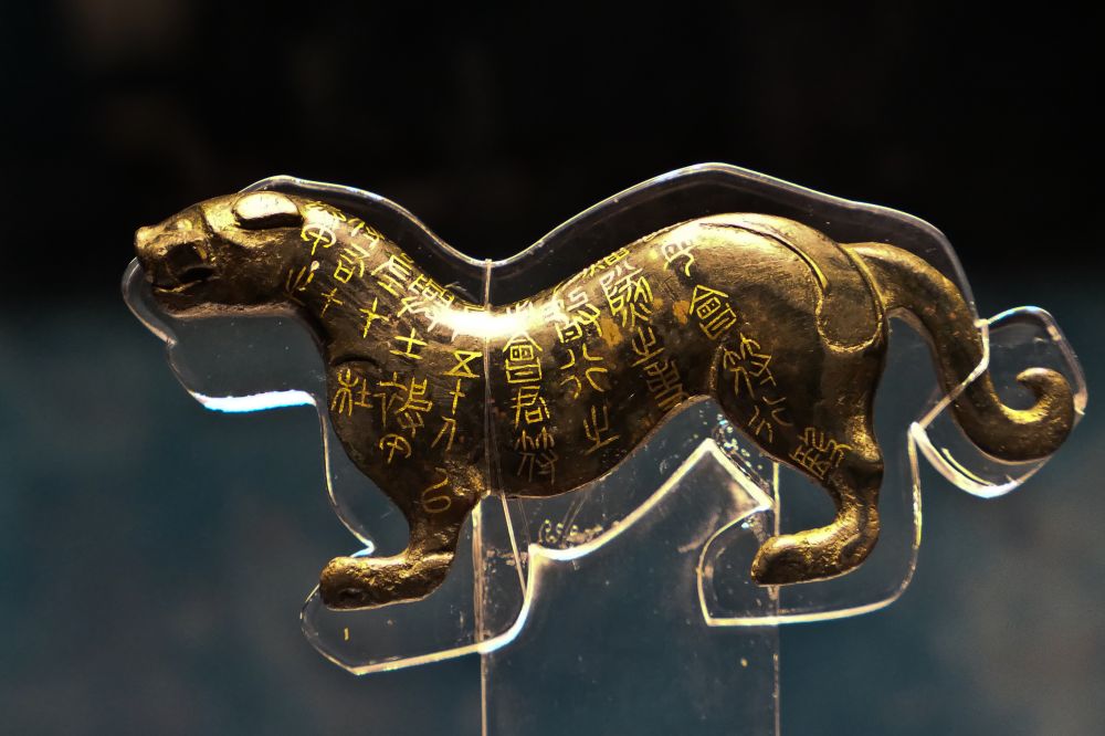 虎身镌刻着错金铭文“兵甲之符, 右在君, 左在杜, 凡兴土披甲, 用兵五十人以上, 必会君符, 乃敢行之, 燔隧之事,虽毋会符, 行也。” 虎符分别交予国君和军事将领。凡是要调动五十人以上的军队时,要勘验虎符后才能发兵,烽火紧急时,可以不用虎符。秦国王称“君”者只有惠文君一人。公元前337年,秦惠文君执政。13年后(即公元前325年),他改君称王,杜虎符当为此时之物。
