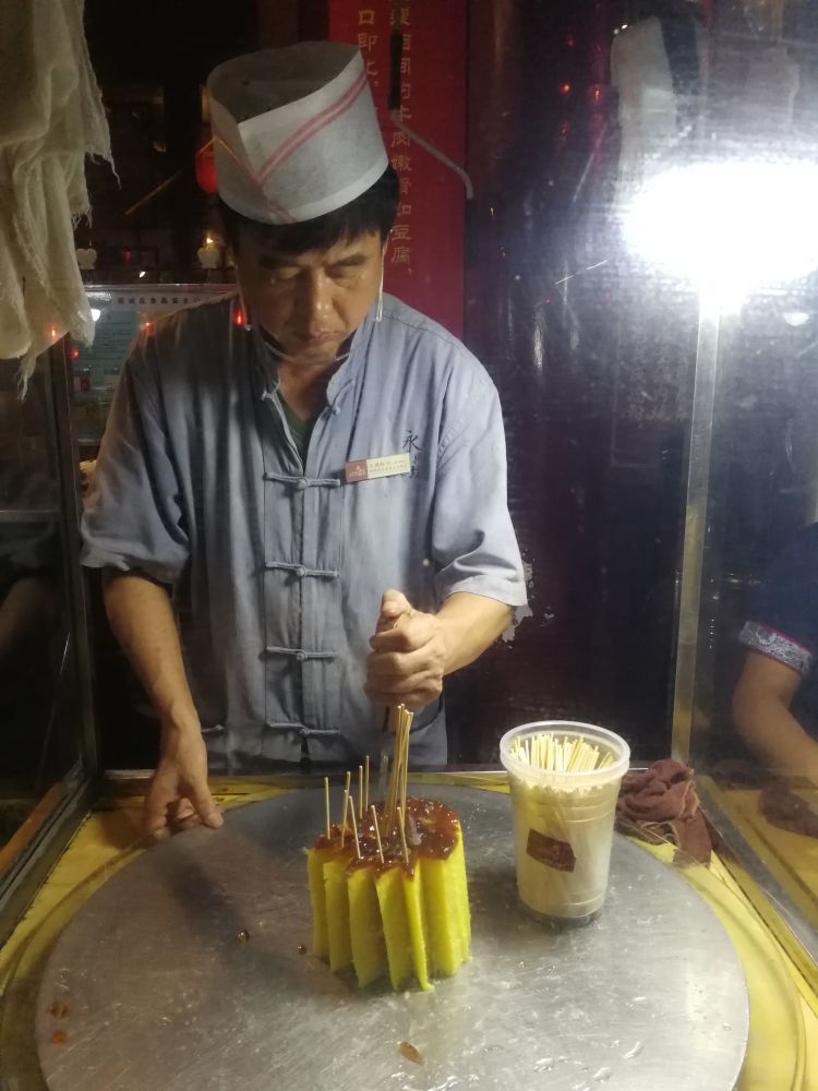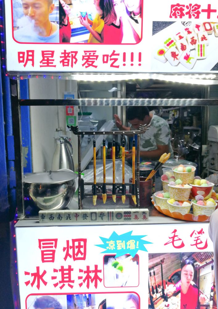 出了酒店往左,沿路有数不清的小店在买网红冒烟冰激凌,毛笔酥。