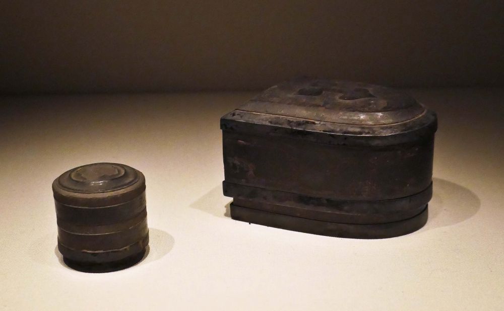 这个黑糊糊不起眼的马蹄形的盒子,曾是汉朝最高贵的用具。这是个漆盒,盖面用银片镶贴出四叶纹,边沿用银片包镶,外绘云气纹,是汉代妇女盛放梳子、篦等妆具的用器。这件漆盒的匣盖镶有银质四叶,边沿并以银片包镶,内外绘云气纹,就是当时的釦器。