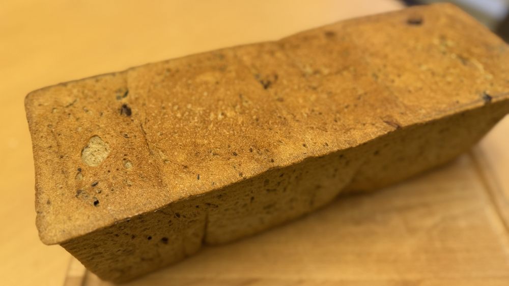 有一次面比较多,烤的过程挤满了面包盒的各个角落,有了一个平平的长方形的面包。通常是上面那样。