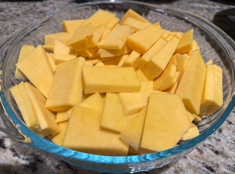 我一般把南瓜切片盖上盖子在微波驴里转十分中左右,根据南瓜的多少,可长可短,中间也可能需要搅一搅。南瓜熟后,用勺子压成泥。做这种面包不需要非常细腻。如果做南瓜馒头或发糕,需要用Vitamix打成细的南瓜泥。