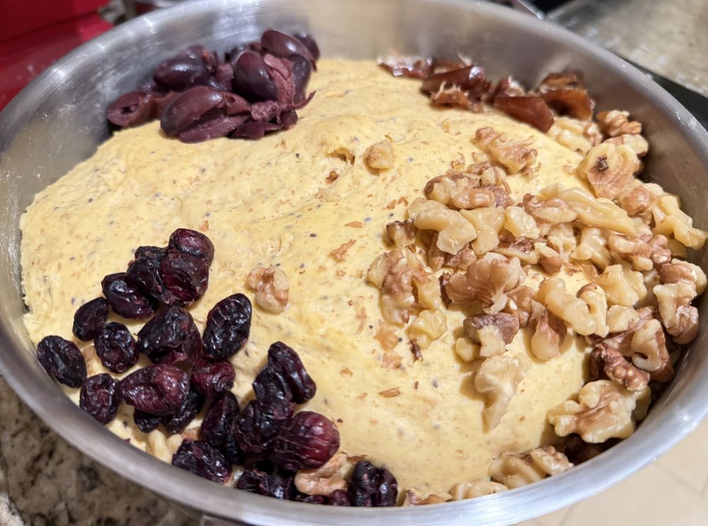 一次发酵之后,放入切小的干果仁,或者再用厨房机搅一搅,或者用手象做免揉面包那样把干果仁揉进面里。然后放置二十到半个小时,再象做免揉面包那样压,拉,叠几次。因为不是高筋面,并不能拉很长。再置二十到半个小时。然后重复上面的动作。总共三次。这样做出的面包口感好,劲道。