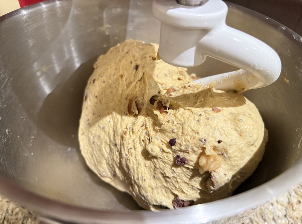 (1) 固定面的多少(三杯面,这个量正好放到我的面包盒中),边搅动边加南瓜泥,慢慢加,直到面刚好搅成团。搅动期间加入CHia 子