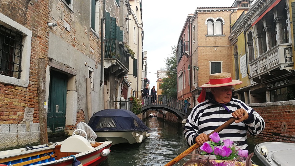 早上出门还没走两步,女士们就被坐在路边招揽生意的“船工”老汉忽悠着上了“贼船”。说好45分钟的贡多拉滑行被缩减成40分钟,距离圣马可广场还小有一段距离就让我们下去,猜想老家伙没有在那片地区经营的许可。来威尼斯之前,我想着穿行水巷可否有个最佳路线,或徒步漫游是否一定必须“打卡”网红景点。走一趟下来,才体会根本没有必要。