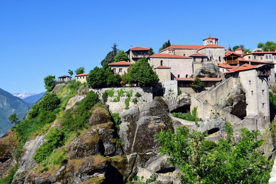 希腊语中它是"悬在空中的意思",这也正是它的与众不同之处。几百万年前,这里是一片汪洋,后来地壳运动和海水的冲击使之变成一片石林,修道院就是坐落在这些高耸的岩石山顶上面。大约1000年前,这里就出现了隐遁的修士。他们靠木梯和绳索攀上了高耸入云的峰顶,居住在天然岩洞内,祈祷、赞颂和忏悔。