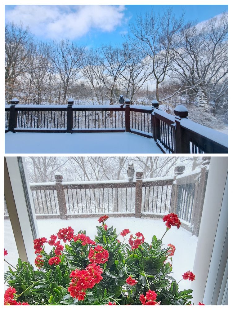 周五圣村下了龙年第一雪。老二学校放假,不过他们跑步训练不休息。他一早短衣短裤开车出去时还没下雪。眼看这大雪飘飘,很快就积了寸许。阳台下长寿花开的灿烂。白雪映红花,我一边欣赏美景,一边担心儿子。好在他中午平安归来。他说在小区入口时滑出去一点点。还给我看他们队员雪中跑步的视频。雪停日出,一时间绿叶红花,蓝天白云,美!