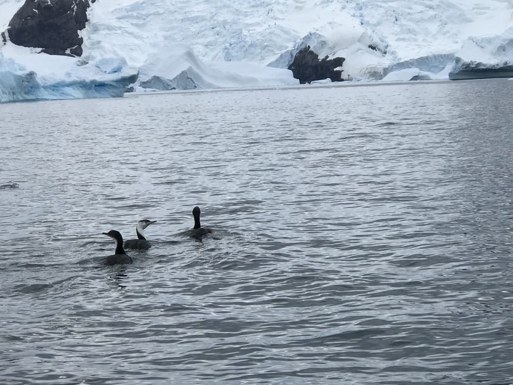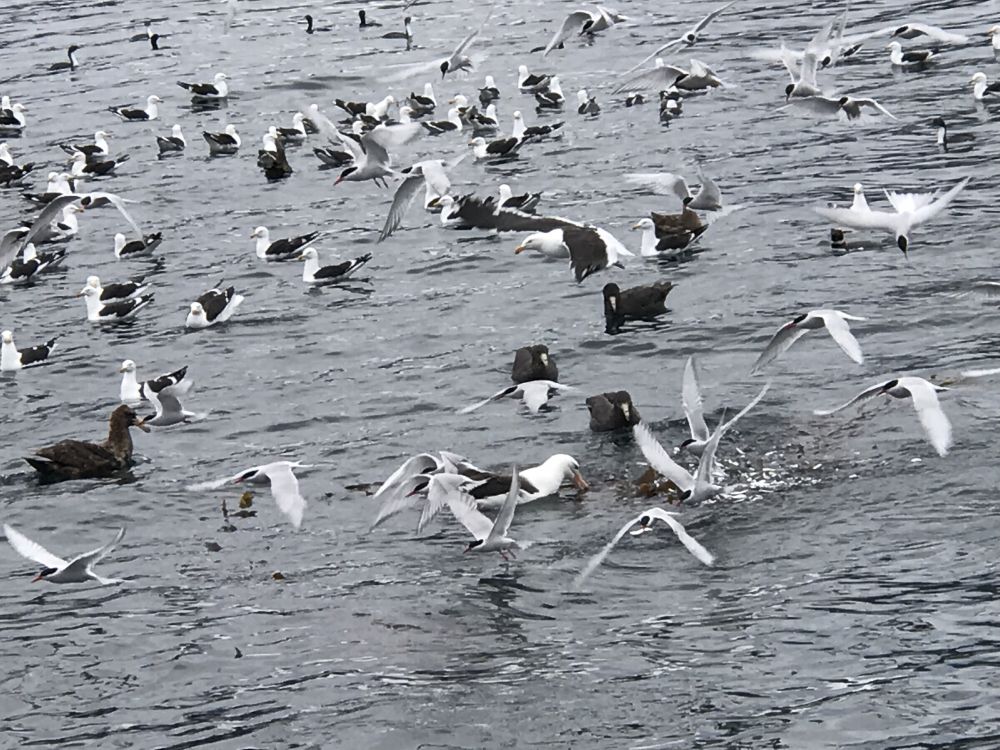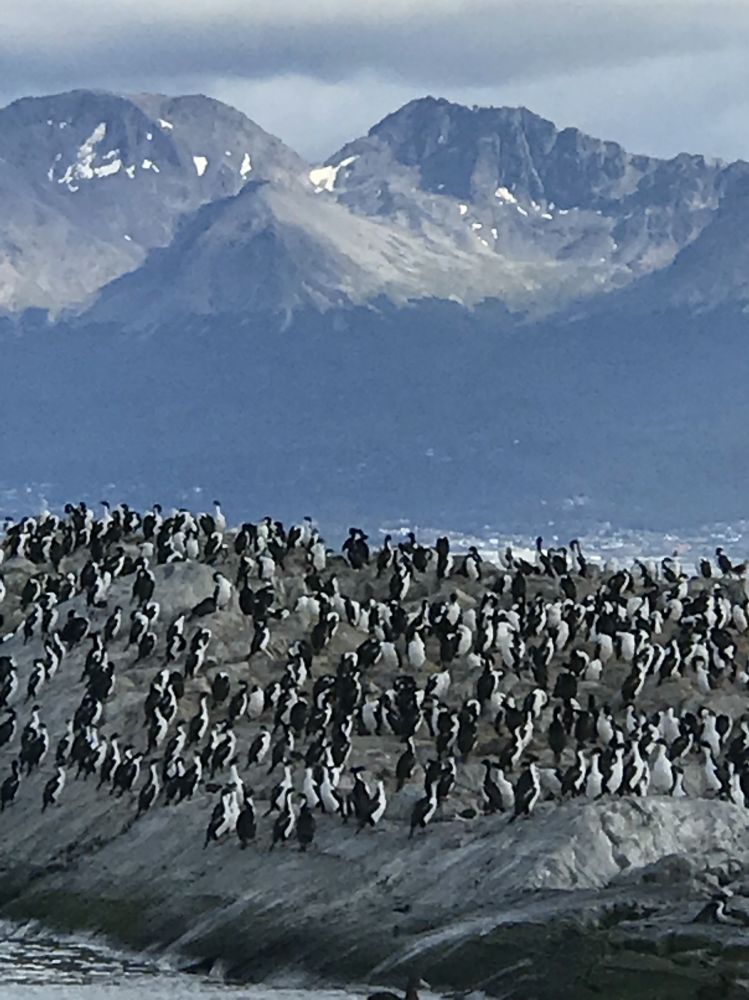我在乌斯怀亚登船去观看企鹅岛上的企鹅时,有机会看到一幕相似的围猎,不过打猎的不是鱼鹰,而是麦哲伦企鹅。一开始是满天的信天翁海鸥嚷嚷着,它们不停的朝一块固定的水域俯冲,接着,舰桥上的导游传下话来说,右舷鸟群正在争抢水面的沙丁鱼,所有的乘客一下子涌到船的右舷,哇,浮在水面的海藻上,沙丁鱼的鲮片在阳光的照射下丛丛闪耀,大个的信天翁守在海藻旁享受着无端送来的美味,海鸥燕鸥都争着来衔取……。我拍了一段视频,等到回舱重新细看的时候才发现,这一幕精彩大餐的发动者竟然是麦哲伦企鹅。沙丁鱼为了逃生躲进了海藻,却成了群鸟的美餐。我看见麦哲伦企鹅一连串的在海面浮出时心想,这个时候的海水下面不知有多热闹。