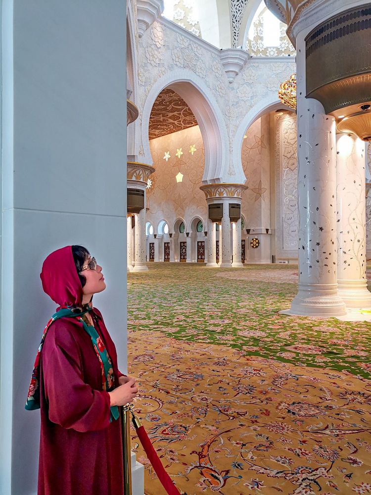 旅行时去参观清真寺,对女性有“严密”着装的要求。夏天热,阿拉伯沙漠的夏天更热,即使不愿意,你也得把自己裹得跟个粽子!许多女子用围巾遮住了头发和脖子,但因为仍然露出了手腕而被告知不行,最终被套上一件从头到脚的阿拉伯长袍。