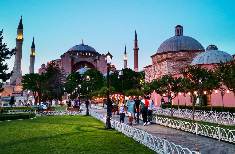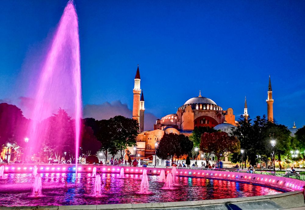 步上蓝色清真寺所处的高台,正对面就是圣索菲亚大教堂,中间很大一块空地是绿草花园和喷泉水池。假设蓝色清真寺就是东罗马皇宫原址,那么它的左侧是罗马竞技场,和一座地下宫殿,对面是教堂,教堂的一侧是地下水宫,和古希腊人一样,罗马人最珍视水,这基本上就是一个完美的皇宫广场格局。不过土耳其人并没有给出答案,大概是怕影响我们对蓝色清真寺的看法。