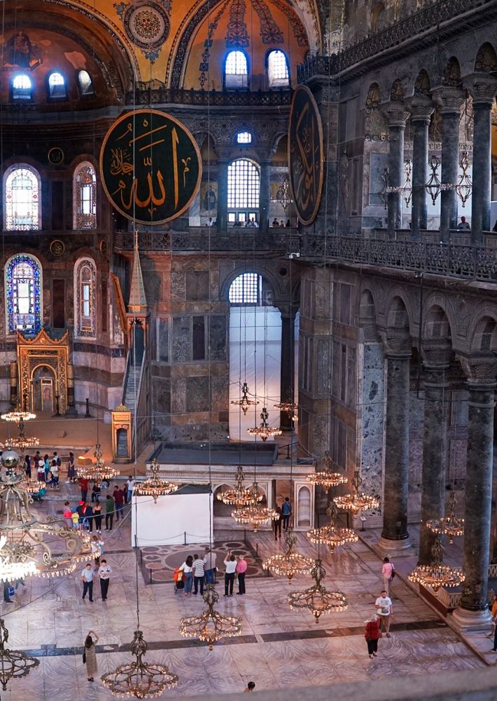 罗马帝国在自己多神教的传统中挣扎着改信基督教,最早的圣索菲亚教堂是君士坦丁大帝迁都时建的,之后两次被烧毁,重建的大教堂成为罗马建筑中前所未有的一件杰作,这也同时表明了罗马帝国为竖立基督教绝对信仰的决心。