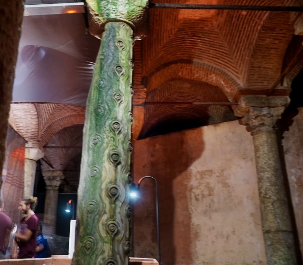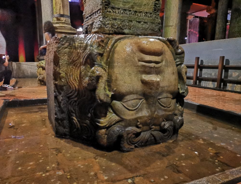 水宫中唯一使游客感兴趣的,是两根压着美杜莎头像的柱子。镇妖辟邪,但美杜莎不是妖,是希腊神庙的守护神,但属于凶神恶煞。镇住美杜莎是寓意反对多神教。