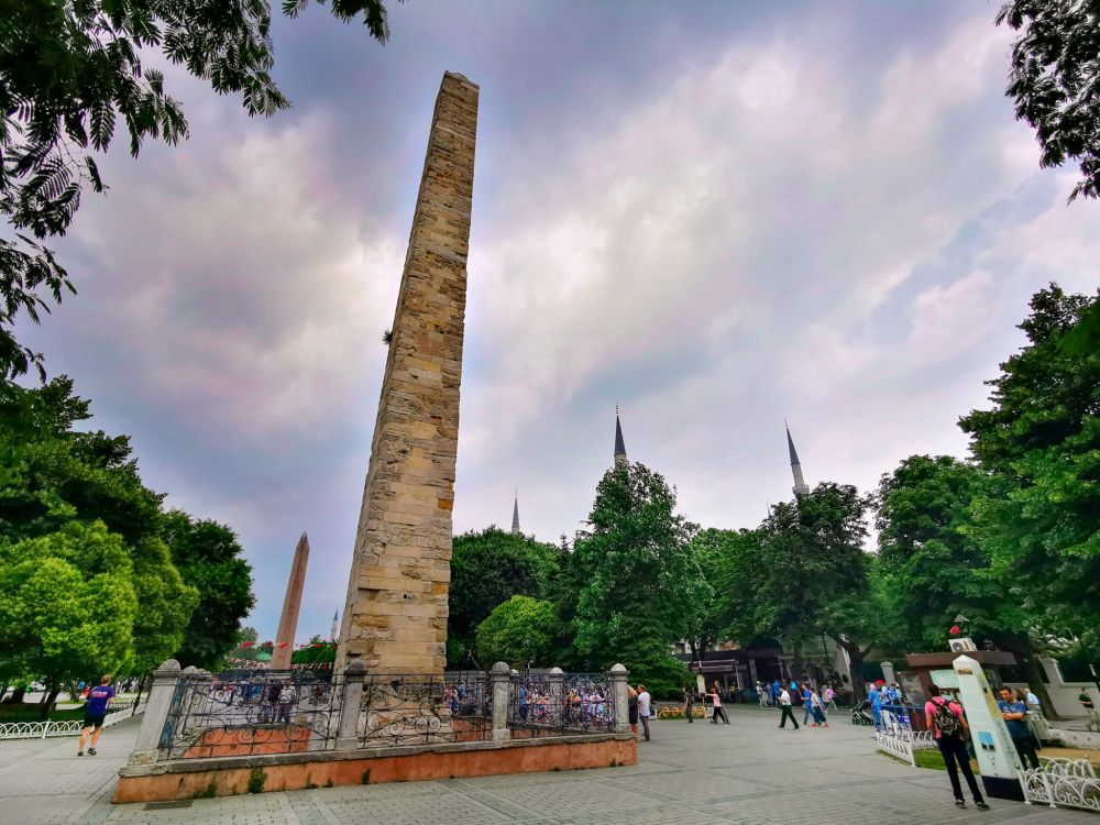 蓝色清真寺左侧的罗马竞技场,只剩下一个名字和一片空旷,广场上只有三座纪念物:一是罗马人的方尖碑,据说本来是用铜片包裹着的,第四次十字军东征时,洗劫君士坦丁堡的士兵们没见过大块的黄金,就把铜片挖下来带走了。现在里面裸露出来的砖块仍使我惊讶,里面是用什么骨架来支撑又细又高的结构?
