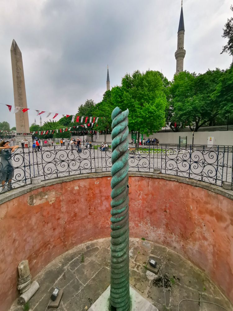 三是一座三头蛇柱,是罗马人从一座古希腊神庙中搬来的,当时的蛇头造型一定非常吸引罗马人,三条蛇缠绕的螺旋纹精致完美,而且它是铸铜的,表面的铜锈呈现优雅的青绿色,可惜这三头蛇的头已不知所踪。