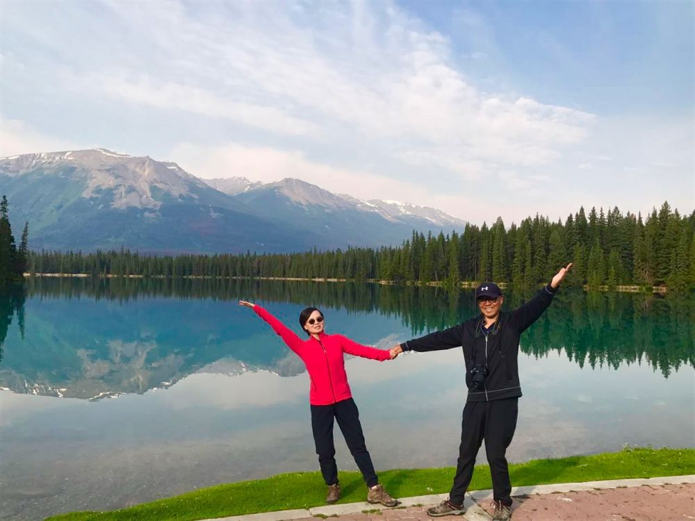 DAY 8--- 今天将从 Jasper 驾车返回 banff. 清晨观赏了三个?珍式宁静小湖 ( lake Edith, lake Annette and Lac of Beauvoir. ). 随后我们去了此行计划中的第三个 Jasper Fairment hotel. 在湖畔,大家兴奋之余,情不自禁地????跶 high 。