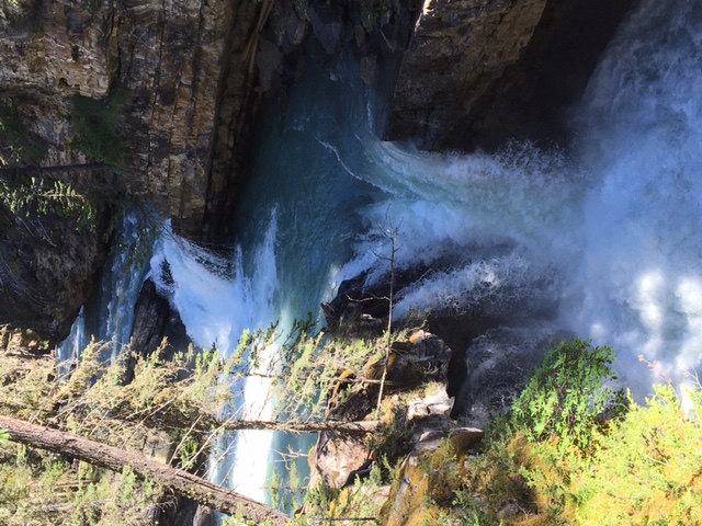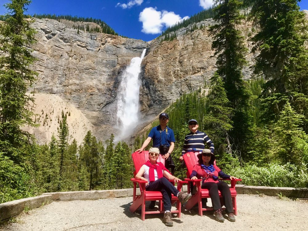 下午我们游走了 Nature bridge and Takakkaw falls 瀑布。顺便介绍一下在加拿大公园里时常会看见的红色椅子 red chair. 这些椅子一般都会面对绝佳的风景,当这些椅子成为主角时,总能拍出让人警喜的画面。John 总是能找到这些红色椅子,时常给我们几个带来一点小小警喜,并且能看到行程中最美丽,最上镜的风景。瞧这张四人合影,多么得意呵!