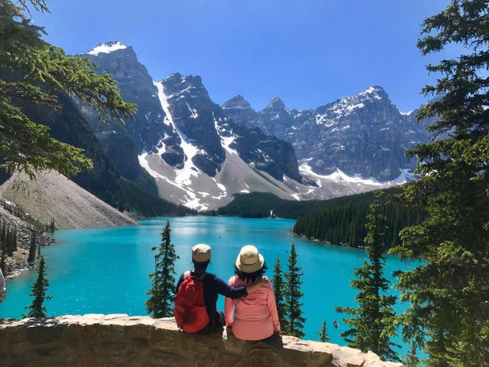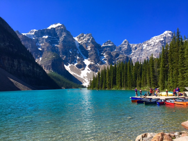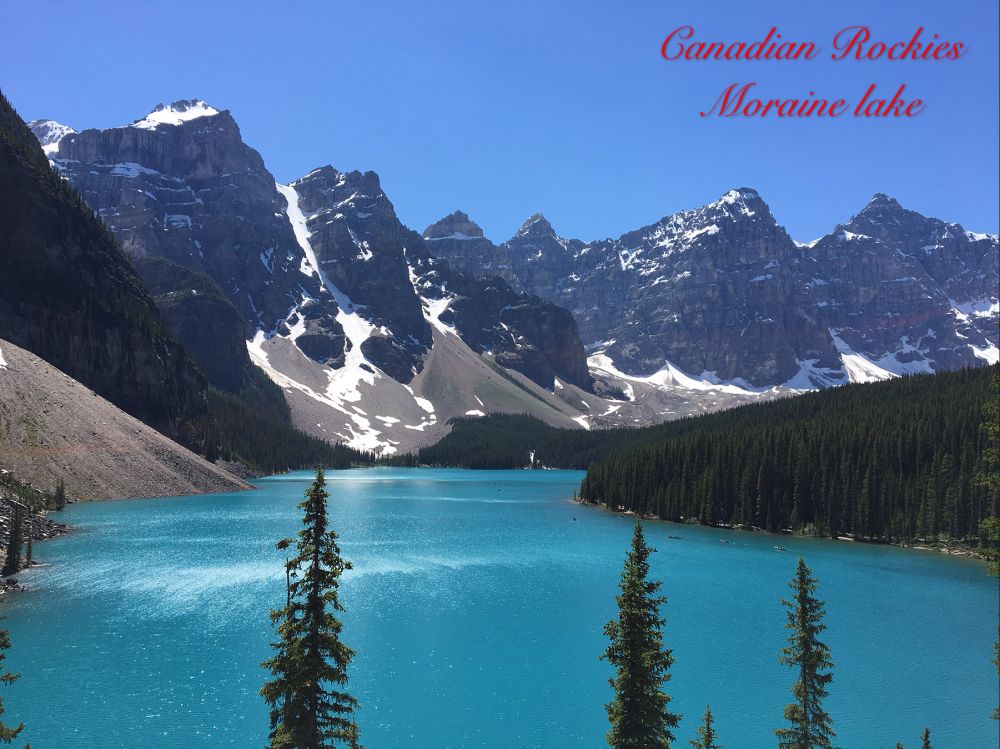 DAY 5 --- 原本起早是想去拍 Vermillion lake 的 sunrise 清晨美照。结果蚊子实在是太多, 立马急转湾改道去 Moraine lake. 在 Lake Louise village 坐 shuttle bus 经过蜿蜒小道把我们带入了梦莲湖 ( cash only accepted, the fare is $30 for adult return trip)。梦莲湖坐落在著名的十峰谷 ten peaks中,它曾是$$20 加元纸币上的图案。由于湖底沉积了含矿物质的碎石,形成了变幻多姿的碧蓝色湖水,随着阳光的照射,不同的时间,不同的角度展现出不同的颜色,仿佛置身于仙境之中。