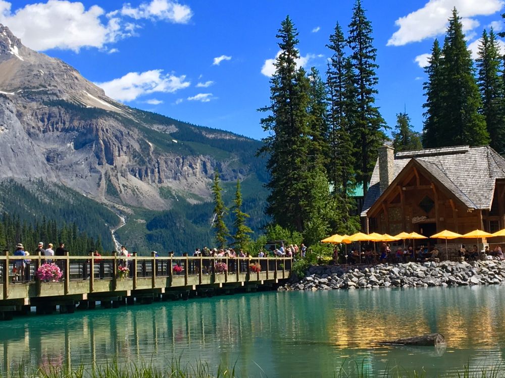 DAY 4 --- Yoho National Park--- Emerald lake 又称翡翠湖。一眼望去就被一座直桥深深吸引。桥边上的露天咖啡厅,那些黄色阳伞为碧绿的翡翠湖起了画龙点晴之效。雪山与森林围绕着翡翠湖,世外桃源般的小木屋别具风格,我们沿着湖边周游一圈,湖水闪耀着绿瑩塋的光芒,梦幻般的镶嵌在群山之中,与世隔绝。宁静的湖面,如同十八岁少女的心,除了对爱情的憧憬,别无其他。山风吹来,一湖碧水,涟漪四散,美丽无比。